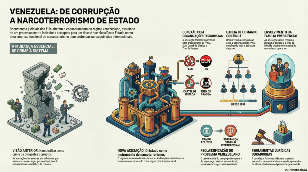 Nas últimas horas tornaram-se públicos dois documentos judiciais norte-americanos que, lidos em conjunto, ajudam a compreender uma mudança profunda na forma como os Estados Unidos — e, por arrasto, a comunidade internacional — passaram a enquadrar o regime venezuelano liderado por Nicolás Maduro.