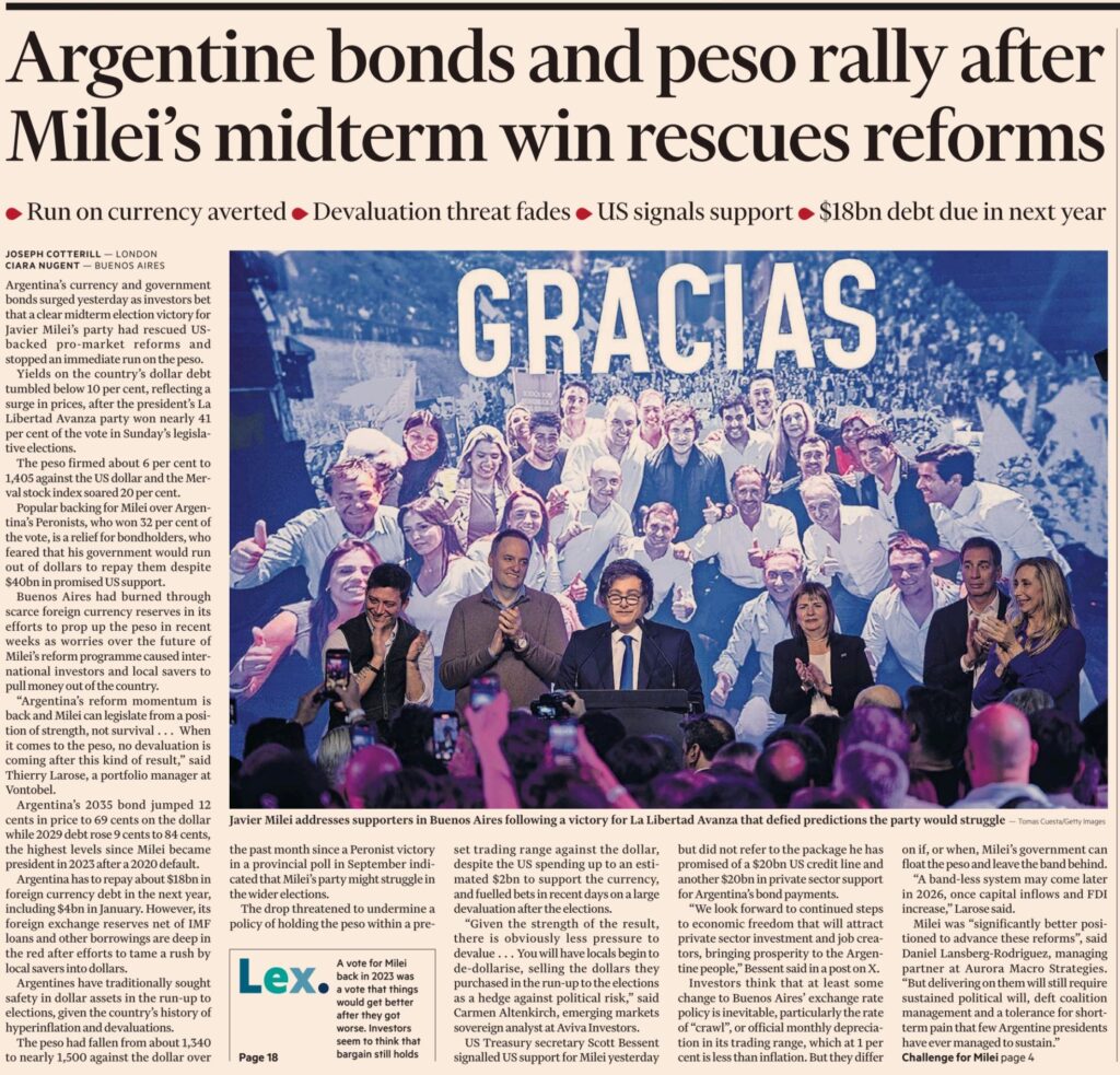 O jornal global anunciou o improvável: o peso argentino voltou a subir, os títulos públicos valorizaram e Javier Milei saiu das eleições de meio de mandato com o mercado aos seus pés. Por um instante, a Argentina pareceu respirar.