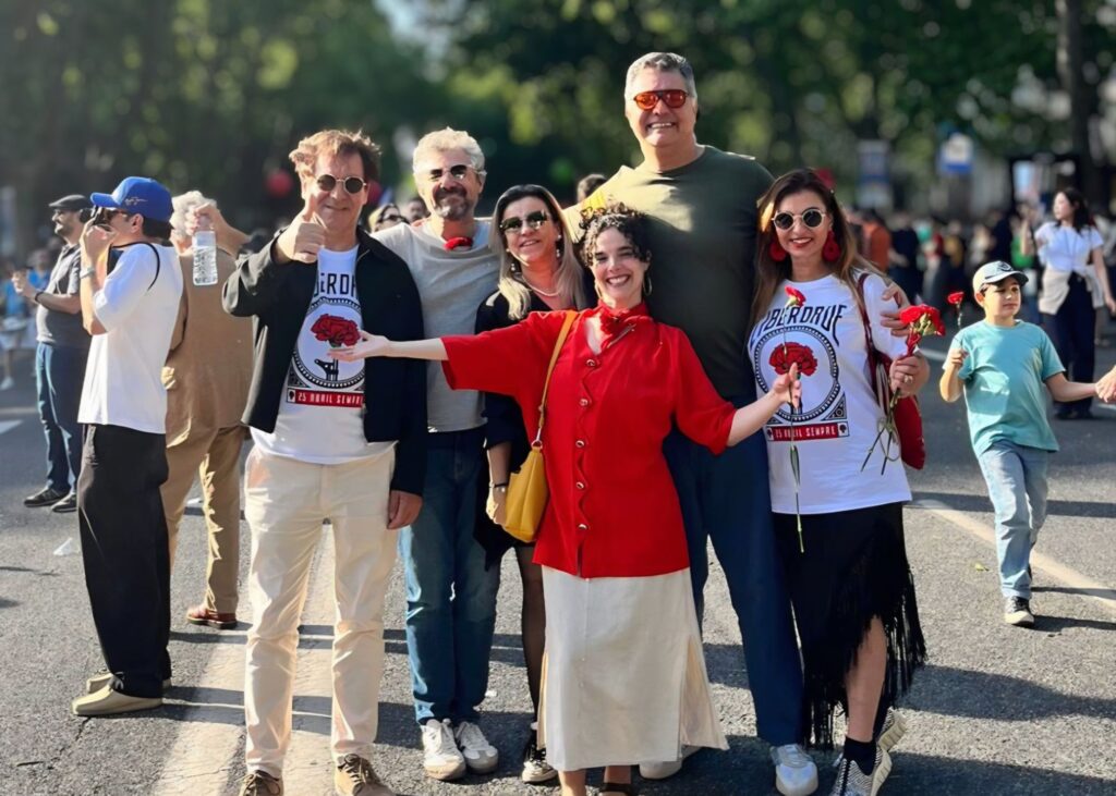 Foi então que ele apareceu, sorrindo, braço estendido, a flor vermelha entre os dedos. Um gesto simples, quase infantil, como quem oferece água, pão, uma maçã, uma desculpa. A flor tremia um pouco no ar. Talvez fosse o vento. Talvez fosse a mão. Talvez fosse a própria história, cansada de estar nos livros, tentando voltar ao corpo.