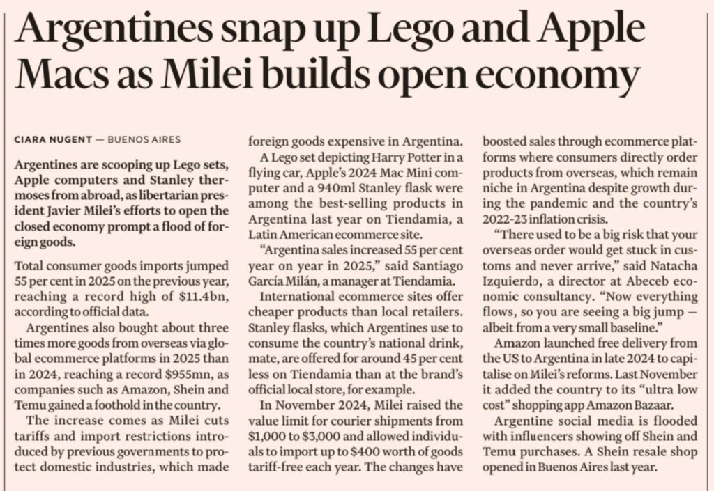 O entusiasmo argentino por Lego importado, computadores da Apple e garrafas Stanley não é um detalhe pitoresco de consumo: é um sinal avançado de uma mutação que atravessa o Atlântico Sul. Sob o governo de Javier Milei, a abertura comercial transformou o e-commerce internacional num atalho para a normalidade global. Comprar deixou de ser um ato de resistência para se tornar um gesto banal — e isso, na Argentina, é revolucionário.