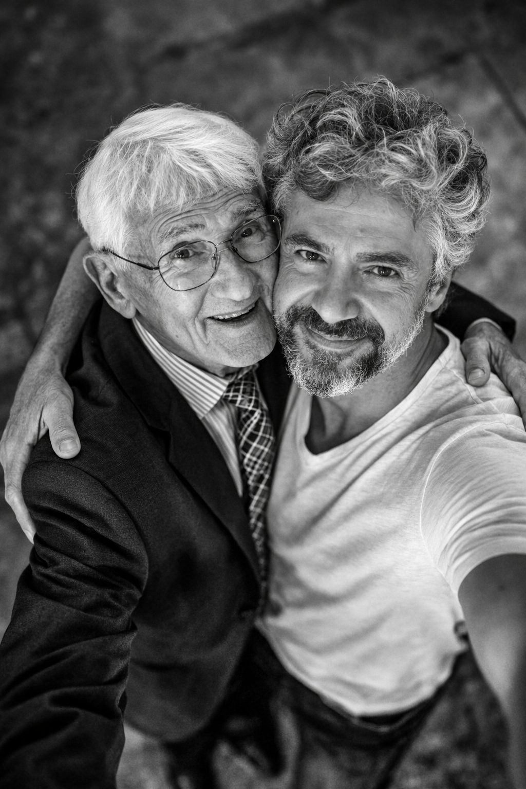 Prompt: Uma foto autêntica e afetuosa de dois homens amigos, tirada de cima. Eles estão abraçados, com os braços um em volta do outro, e olhando para a câmera com sorrisos radiantes e genuínos nos rostos. Seus olhos estão voltados para cima, diretamente para a lente, criando uma conexão pessoal. O fundo é levemente desfocado, dando destaque à expressão de alegria e cumplicidade dos dois. O estilo é preto e branco, estilo magnum, formato retrato 5×4