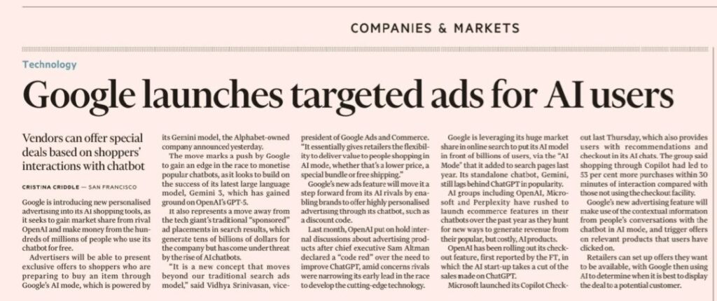 Durante décadas, a publicidade viveu fora do pensamento. Esperava-nos na página seguinte, no intervalo, na lateral do ecrã. Agora, pela primeira vez, ela surge no interior da conversa, no exato momento em que a dúvida ainda não se transformou em decisão. É isso que muda quando o Google passa a inserir anúncios personalizados dentro da interação com a sua inteligência artificial.